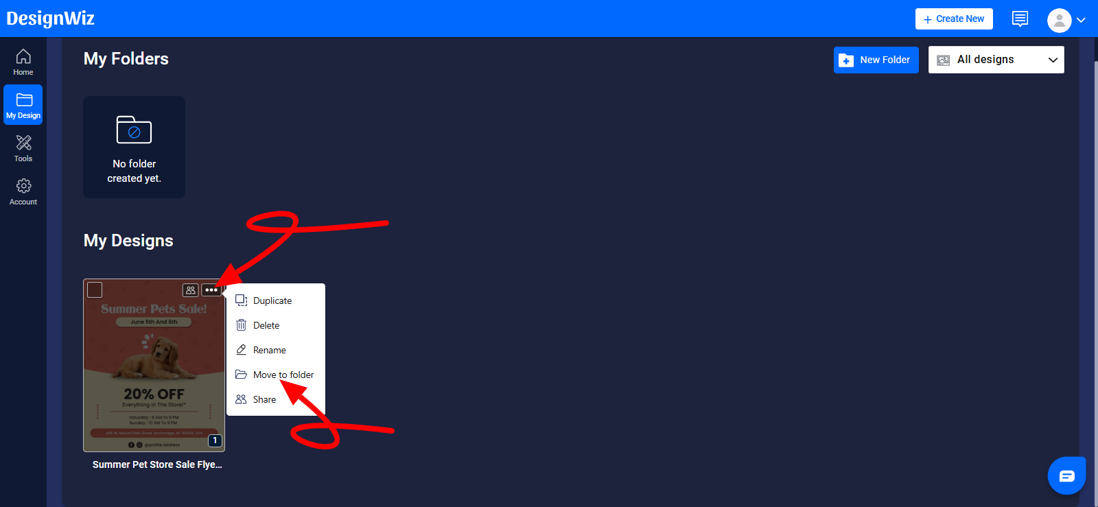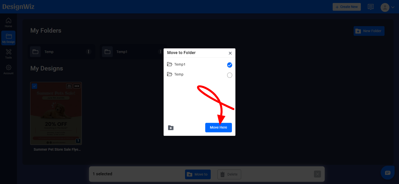 4. Select the folder where you want to move the design from the pop-up window, and then click on Move Here.